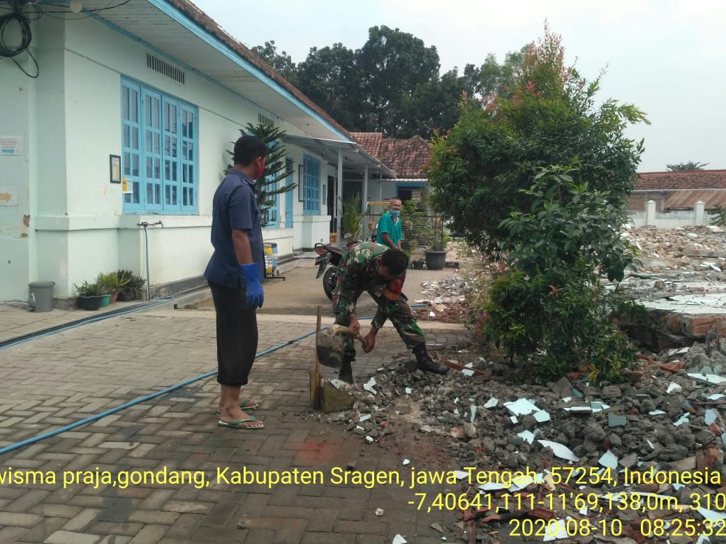 Senin, 10 Agustus 2020 pukul 08.10 wib s/d selesai Serda Asih Widodo Babinsa desa Gondang Anggota Koramil 06/Gondang melaksanakan Karya bakti memindahkan dan membersihkan brangkal diperuntukkan parkiran Puskesmas Gondang.