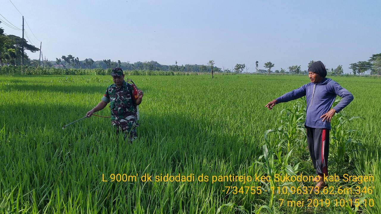 Selasa, 7 Mei 2019 Kopka Ari wibawa Babinsa ds. Pantirejo anggota Koramil 13/Sukodono membantu melaksanakan penyemprotan padi milik Rusman Dk.Sidodadi Ds. Pantirejo Kec. Sukodono, Varietas Ciherang.