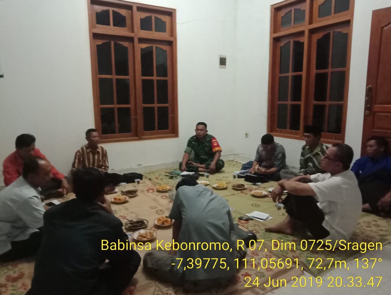 Senin, 24 juni 2019 Pukul 19:30 s/d 21:00 wib Babinsa Ds. Kebonromo Serda Suyono melaksanakan kegiatan komsos dengan tokoh agama dan tokoh pemuda di Dk. Ngampunan Rt. 23 Ds. Kebonromo Kec. Ngrampal Kab. Sragen.