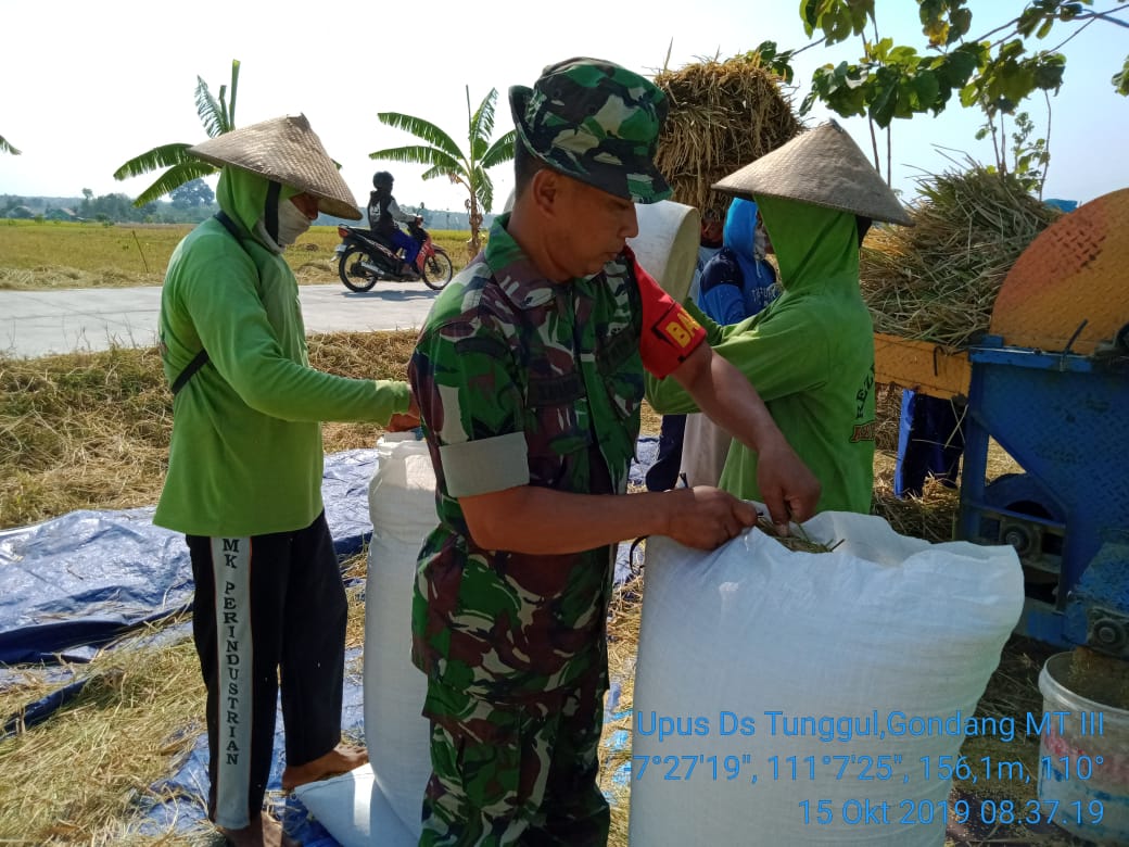 Serka Sutarno Babinsa  Tunggul  Anggota koramil 06/Gondang melaksanakan pendampingan upsus panen padi Varietas mentik  wangi dengan luas sawah MT3 413 ha di persawahan milik Sukir dk. winong RT 22  Ds. Tunggul, Selasa ( 15/10/19 ).