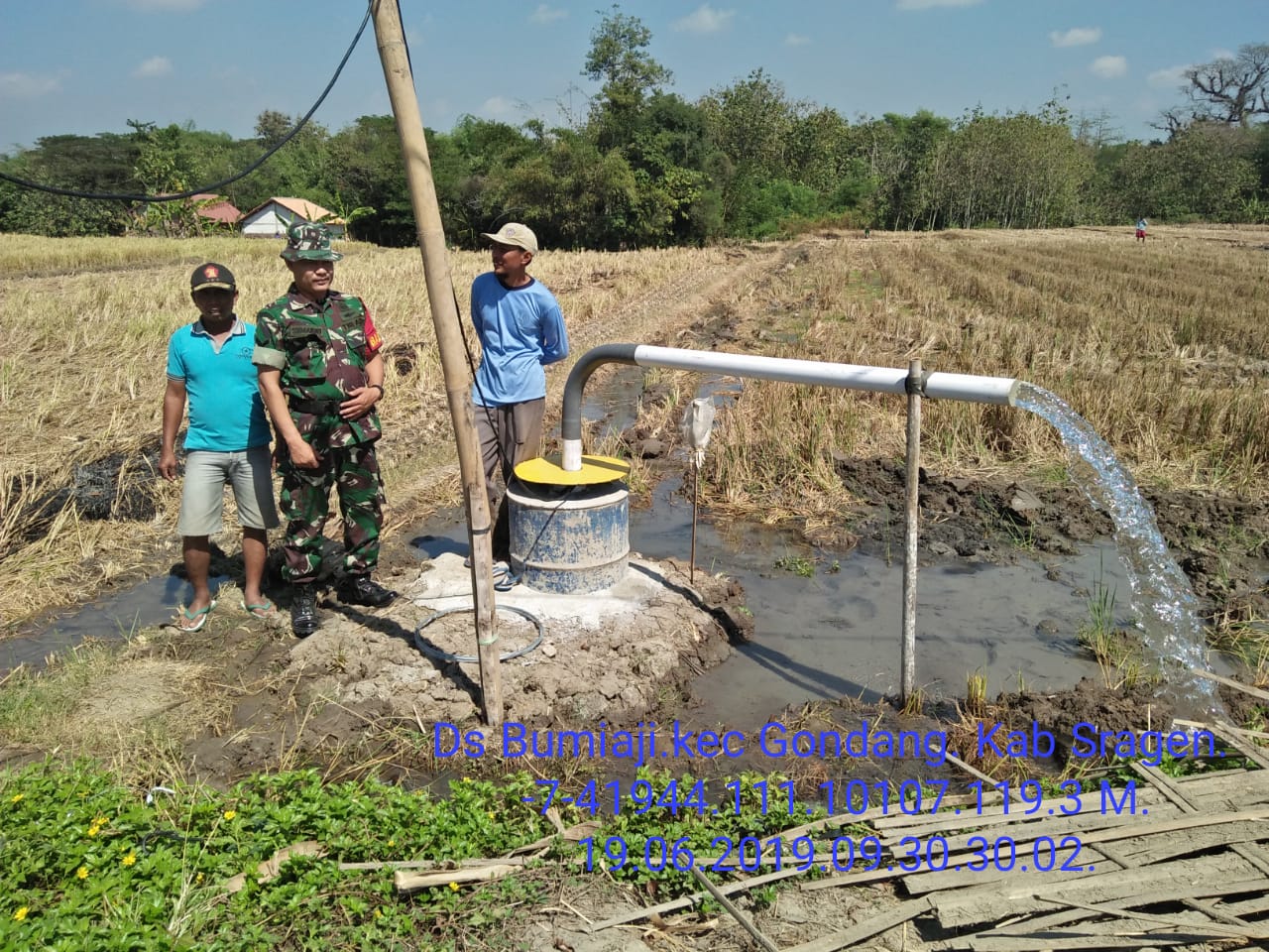 Rabu, 19 Juni 2019 pukul 09.30 wib – selesai Serda Sumarno Babinsa Ds.Bumiaji anggota Koramil 06/Gondang melaksanakan monitoring pengairan sawah Bp. Giman Dukuh Dunggandu RT 22 Desa Bumiaji , varietas menthik, umur bibit padi 7 Hari dengan menggunakan sumur sibel.