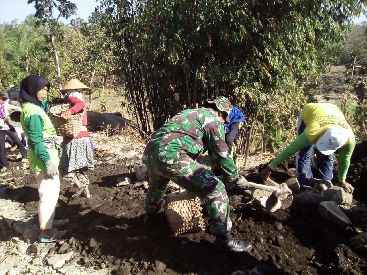 Dengan penuh semangat dan suka cita, Serka Riyantono bersama masyarakat secara gotong-royong menguruk jalan yang biasa di lalui oleh warga.