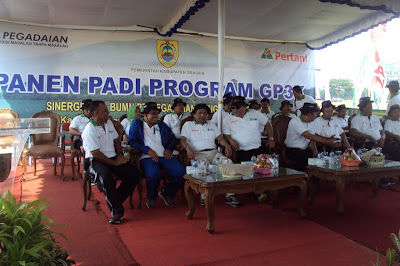 Dandim 0725/Sragen letkol Inf R. wahyu sugiarto S.Ip bersama Forpimda Sragen menghadiri kegiatan Panen Raya Program GP3K Sinergi PKBL BUMN PT. Pegadaian dengan PT. Pertani bersama masyarakat pada Tgl. 2 Nopember 2012 di Ds. Karang Tengah Sragen. Kegiatan Panen Raya ini merupakan wujud kerjasama antara PT. Pegadaian dengan PT. Pertani bersama masyarakat dalam pola tanam padi sehingga menghasilkan peningkatan produksi baik kualitas maupun kuantitas, sehingga diharapkan dengan peningkatan produksi Padi ini Kab. Sragen akan mampu mempertahankan penghargaan sebagai wilayah penyangga Lumbung Padi di Tingkat nasional