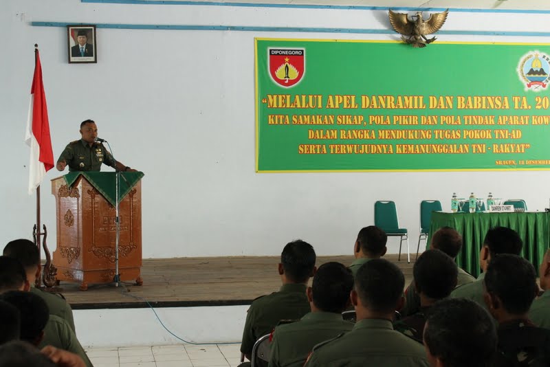 Komandan Kodim 0725/Sragen Letkol Inf. R. Wahyu Sugiarto S.IP membuka Apel Danramil dan Babinsa TA. 2012 Jajaran Kodim 0725/Sragen pada hari Selasa Tgl, 18 Desember 2012 di Gedung Kartini Sragen. Kegiatan Apel Danramil dan Babinsa TA. 2012 Jajaran Kodim 0725/Sragen diikuti oleh 261 personel yang terdiri dari 20 orang Danramil, 220 orang Babinsa dan 21 orang pendukung dengan mengusung Thema ” MELALUI APEL DANRAMIL DAN BABINSA TA. 2012, KITA SAMAKAN SIKAP, POLA PIKIR DAN POLA TINDAK TINDAK APARAT KOWIL DALAM RANGKA MENDUKUNG TUGAS POKOK TNI-AD SERTA TERWUJUDNYA KEMANUNGGALAN TNI-RAKYAT “. Apel Danramil dan Babinsa dilaksanakan disamping sebagai tindak lanjut dari pelaksanaan Apel Danrem dan Dandim yang telah dilaksanakan terpusat di Secapa AD Bandung juga sebagai sarana imbal balik untuk menyampaikan informasi, menyamakan visi misi serta interpretasi dalam menyikapi permasalahan-permasalahan yang faktual di lapangan. Materi yang dilaksanakan difokuskan kepada upaya peningkatan kemampuan aparat Kowil tentang pelaksanaan Binter dalam rangka mewujudkan RAK Juang yang tangguh serta terwwujudnya Kemanunggalan TNI-Rakyat, antara lain :