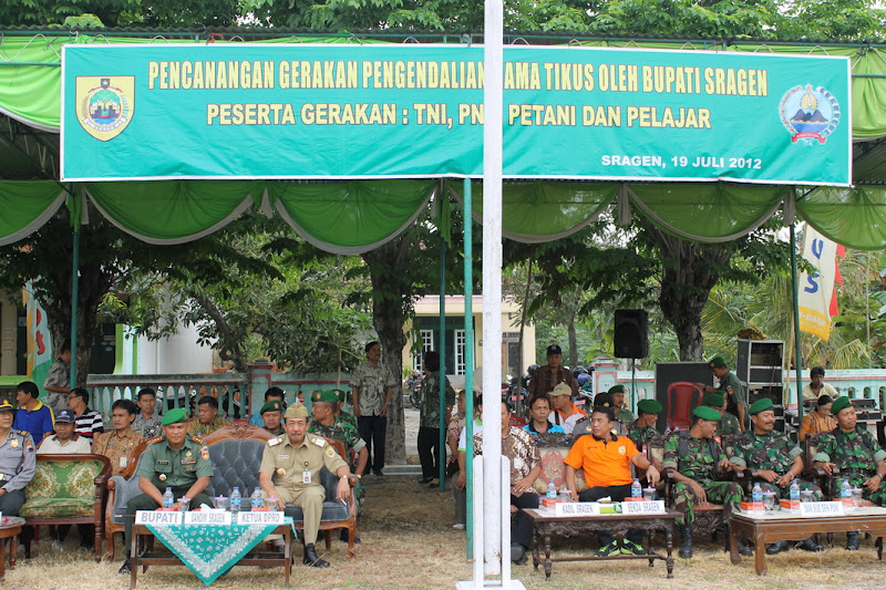 Dandim 0725/Sragen Letkol Inf. R. Wahyu Sugiarto.S.IP mendampingi Bupati Sragen Agus Fathurrahman SH mencanangkan pengendalian Hama Tikus di Wilayah Kab. Sragen. Kegiatan pencanangan pengendalian Hama Tikus ini dilaksanakan mengingat akhir-akhir ini telah terjadi peningkatan populasi dari hama tikus di kab. Sragen sehingga dikhawatirkan Hasil Panen padi akan berkurang bahkan gagal. Kab. Sragen merupakan salah satu lumbung padi diwilayah Propinsi Jateng dan pada periode Th. 2011/2012 ini Kab. Sragen menerima Piagam Penghargaan Peningkatan Produksi Beras Nasional (P2BN) dari Presiden. Dalam amanatnya Bupati Sragen mengajak kepada seluruh masyarakat untuk bersatu padu dan meningkatkan kepekaan serta kepedulian lingkungan termasuk dalam pengendalian hama tikus di wilayah Sragen. Dalam kesempatan yang sama Dandim 0725/Sragen menyampaikan bahwa Kodim 0725/Sragen selaku aparat kewilayahan beserta jajarannya senatiasa siap untuk mendukung program-program pemda. apalagi program-program yang berhubungan langsung untuk peningkatan kesejahteraan masyarakat. Kegiatan pengendalian hama tikus ini akan terus dilaksanakan oleh prajurit TNI bersama masyarakat diseluruh wilayah Sragen. Bupati Sragen juga memberikan bantuan secara simultan alat pembasmi tikus beserta obatnya untuk seluruh kecamatan diwilayah Sragen.
