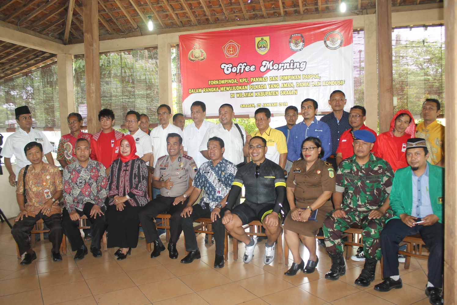 Hadir dalam kegiatan Coffee Morning tersebut Wakil Bupati Sragen Dedy Endriatno, Dandim 0725/Sragen Letkol Arh Camas Sigit Prasetyo, Kapolres Sragen AKBP Arif Budiman SIK,MH. Wadan Yonif Raider 408 Subrashta Mayor Inf Muhamad Isnaini, Ketua KPU Ngatmin Abas, Kajari Kabupaten Sragen dan Dansubdenpom Kapten CPM Yohanes Sigit.