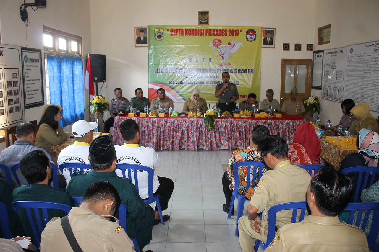 Hal senada juga disampaikan Waka polres Sragen agar masing masing warga menjadi polisi bagi dirinya sendiri, jaga kondusifitas agar tidak terjadi hal hal yang tak diinginkan, beliau juga menambahkan bahwa pada saat pilkades berlangsung akan di terjunkan 500 personil dari polres di tambah dari brimob sebanyak 2 peleton. Ucapan yang sama juga disampaikan Bupati Sragen “yang menang jangan sombong yang kalah harus legowo,beliau juga berharap jangan sampai demokrasi rusak gara-gara politik uang. Acara selesai dilanjutkan pengecekan TPS 7 di Ds.Jetak dan dilanjutkan monitoring ke Ds.Puro Karangmalang, Ds.Kedung upit, Ds.Banyu urip Jenar dan Ds.Jambeyan Sambirejo.