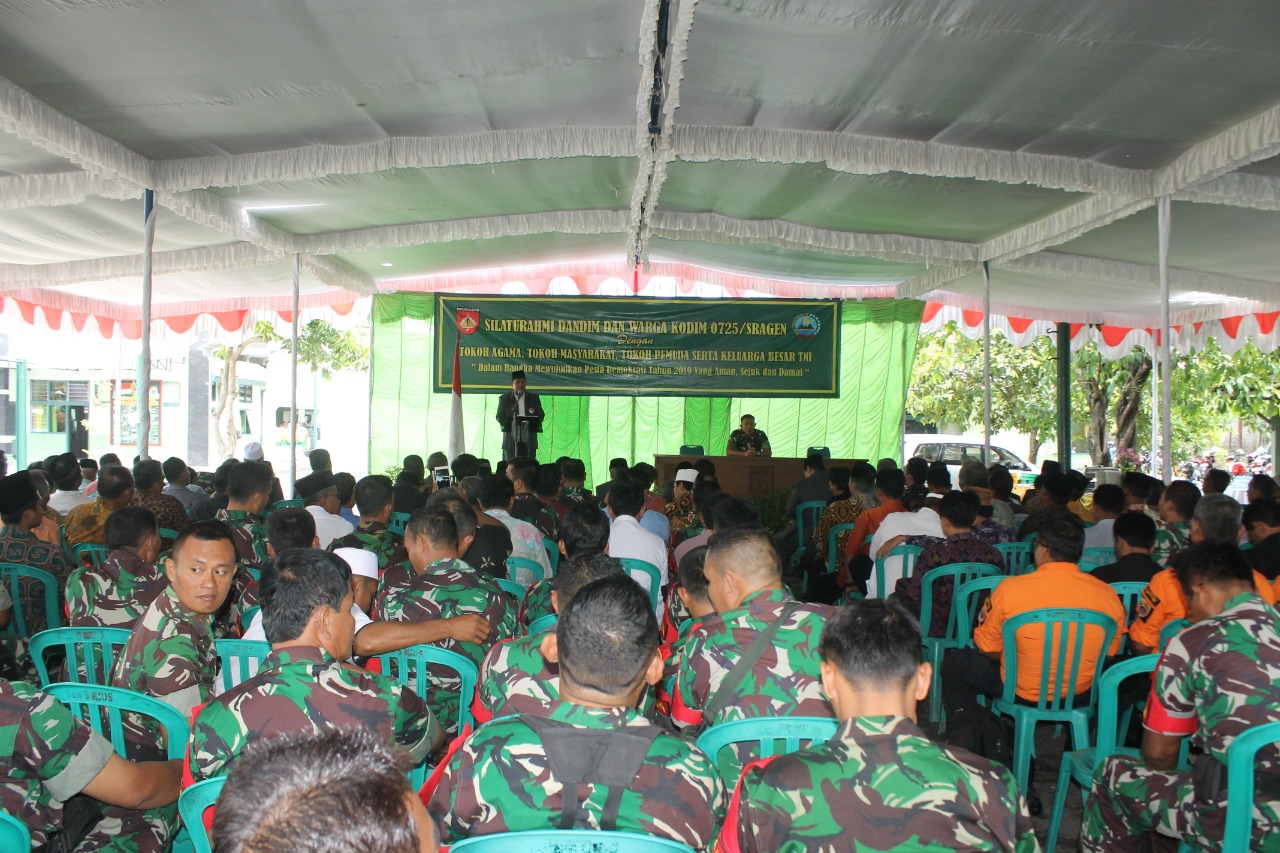 Kamis, 7 Februari 2019 Kodim 0725/Sragen menggelar silahturrahmi dengan Tokoh Agama, Tokoh Masyarakat, Tokoh Pemuda dan Keluarga Besar TNI (KBT ), yang bertempat di Makodim. Kegiatan silahturrahmi ini bertujuan dalam rangka mewujudkan pesta demokrasi Tahun 2019 yang aman, sejuk dan damai.