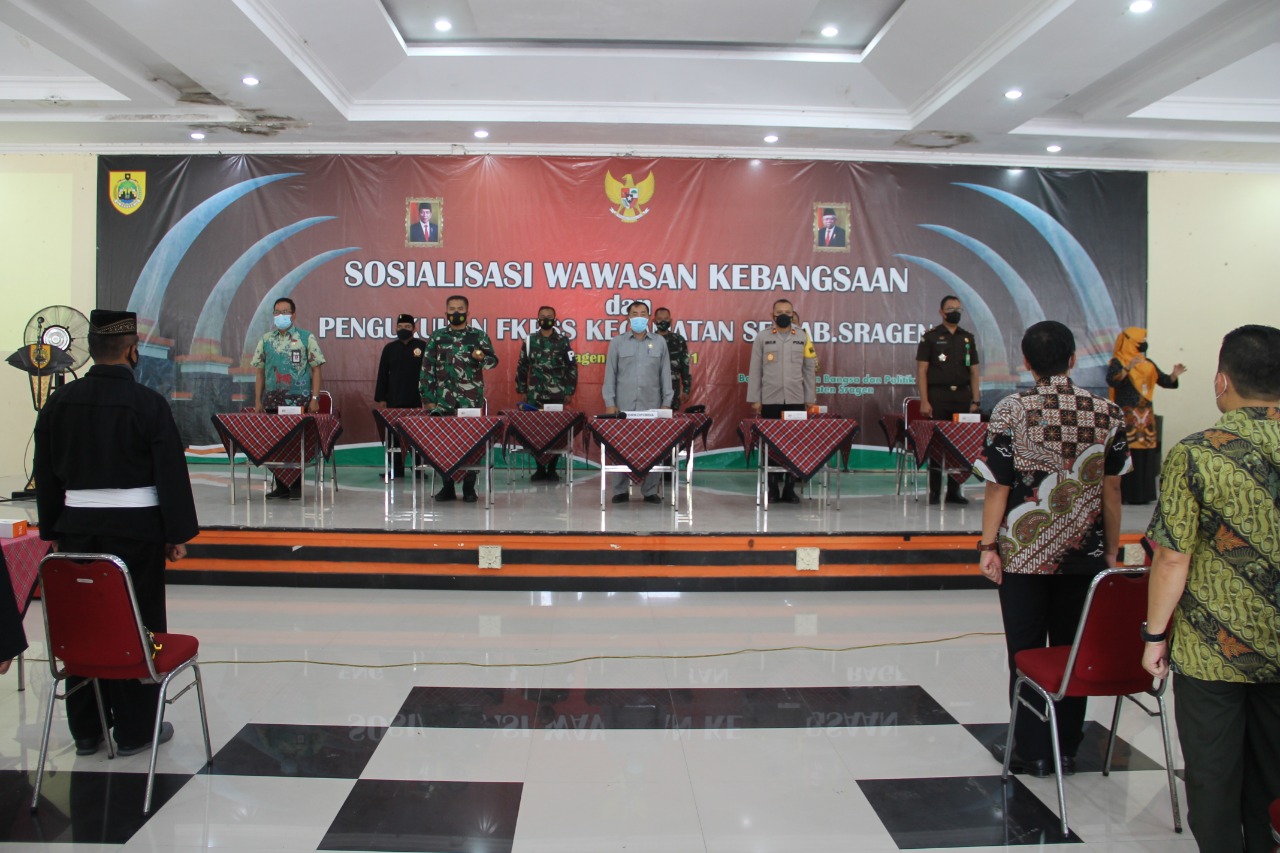 Kamis, 8 April 2021 pukul 13.00 s/d 14.50 Wib di Gedung Kartini Sragen dilaksanakan Sosialisasi Wawasan Kebangsaan dan Pengukuhan FKPPS Kecamatan se-Kab.Sragen sebagai penanggungjawab Drs.Tatag Prabawanto B,MM (Sekda Kab.Sragen).