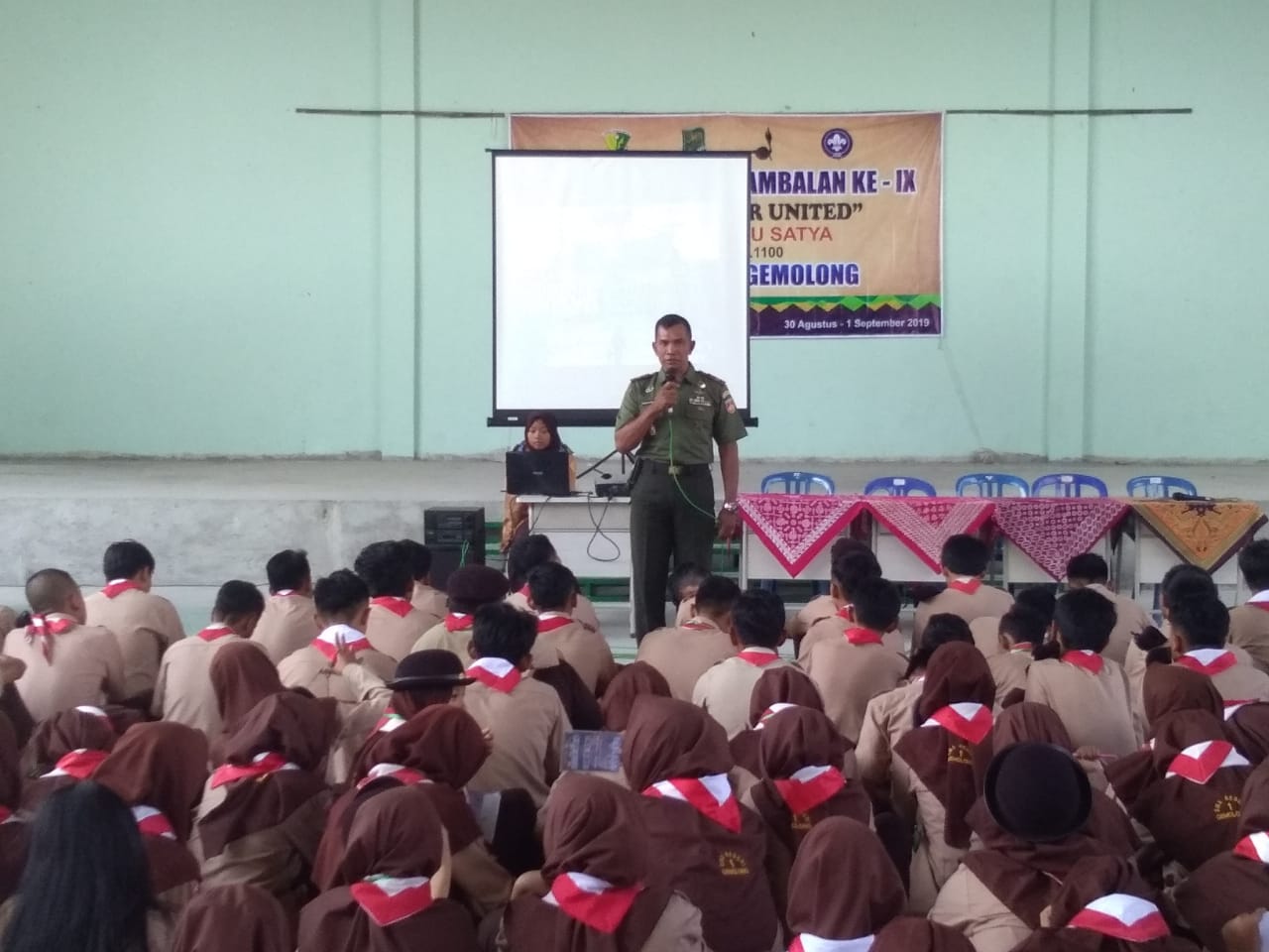 Danramil 15 Gemolong Letnan Satu Inf Prihatin memberikan materi wawasan kebangsaan kepada siswa siswi SMA N1 Gemolong Jml 319 siswa dalam rangka penerimaan Tamu Ambalan Pramuka ke IX bertempat digor serbaguna SMA N 1 Gemolong, ( 31/8/19 ).