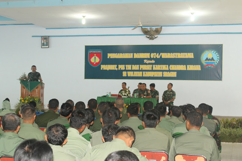Dandim 0725/Sragen beserta seluruh Prajurit, PNS dan Persit se Wilayah Sragen menerima kunjungan Danrem 074/Wrt dan Ketua Koorcab Rem 074 PD IV/Dip pada hari ini, Selasa, 13/11/2012 Pkl. 07.00 Wib di Gd. Kartini Sragen, Kunjungan Danrem 074/Wrt beserta Ketua Persit KCK Koorcab Rem 074 ke Wilayah Sragen dalam rangka pamitan kepada seluruh anggota karena dalam waktu dekat akan menyerahkan Jabatan Danrem 074/Wrt dan melaksanakan tugas di Lingkungan Mabes TNI. Dalam kesempatan tersebut Danrem menyampaikan ucapan terima kasih atas dukungan seluruh anggota sehingga dapat melaksanakan tugas sebagai Danrem 074/Wrt dengan baik, ” tanpa dukungan kalian termasuk juga Persit tentunya saya tidak akan bisa seperti sekarang” imbuhnya, Danrem juga berpesan agar keberhasilan Satuan yang telah diraih baik dalam penugasan maupun Pembinaan teritorial agar terus ditingkatkan, mengingat tantangan tugas kedepan akan semakin berat.