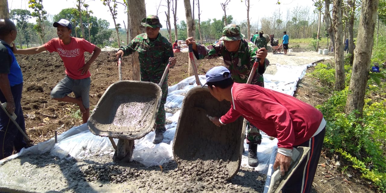 Serma Natalis Babinsa Desa Karangudi anggota Koramil 07/Ngrampal melaksanakan karya bhakti membantu warga masyarakat pengecoran jalan di Dk Nambangan Rt 01Ds Srawung Kec Gesi, Senin ( 21/10/19 ).