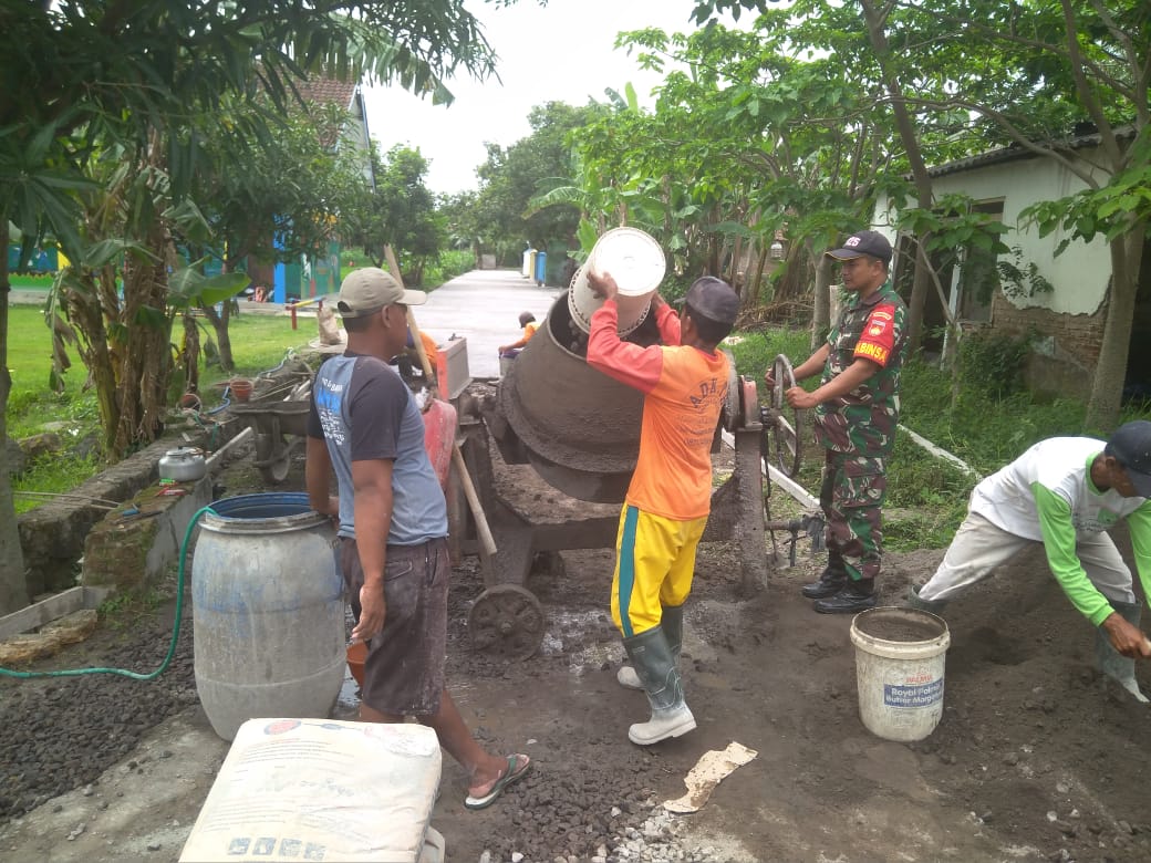 Babinsa Desa Peleman Serka Suripan melaksanakan giat Karya Bakti pengecoran jalan sepanjang 75 meter di Dk.Platuk Rt.13 Desa Peleman Kec.Gemolong Kab Sragen, Minggu ( 03/11/19 ).