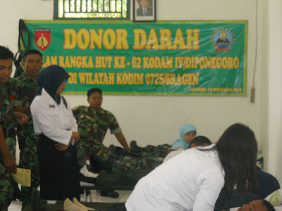 Kodim 0725/Sragen bekerjasama dengan PMI Kab Sragen melaksanakan kegiatan donor darah dalam rangka memperingati HUT Kodam IV/Diponegoro Ke-62 Pada Hari Senin Tanggal 20 februari 2012 bertempat di Barak Sukowati. Donor Darah tersebut melibatkan 115 orang diantaranya dari Personel Kodim 0725/Sragen,Yonif 408/Sbh dan masyarakat. Pelaksanaan kegiatan Donor darah merupakan implementasi dari ST Pangdam IV/Diponegoro Nomor : ST/96/2012 Tanggal 25 Januari 2012 tentang perintah melaksanakan Karya Bhakti TNI, Donor darah dan Anjangsana dalam rangka peringatan ke-62 HUT Kodam IV/Diponegoro tahun 2012.
