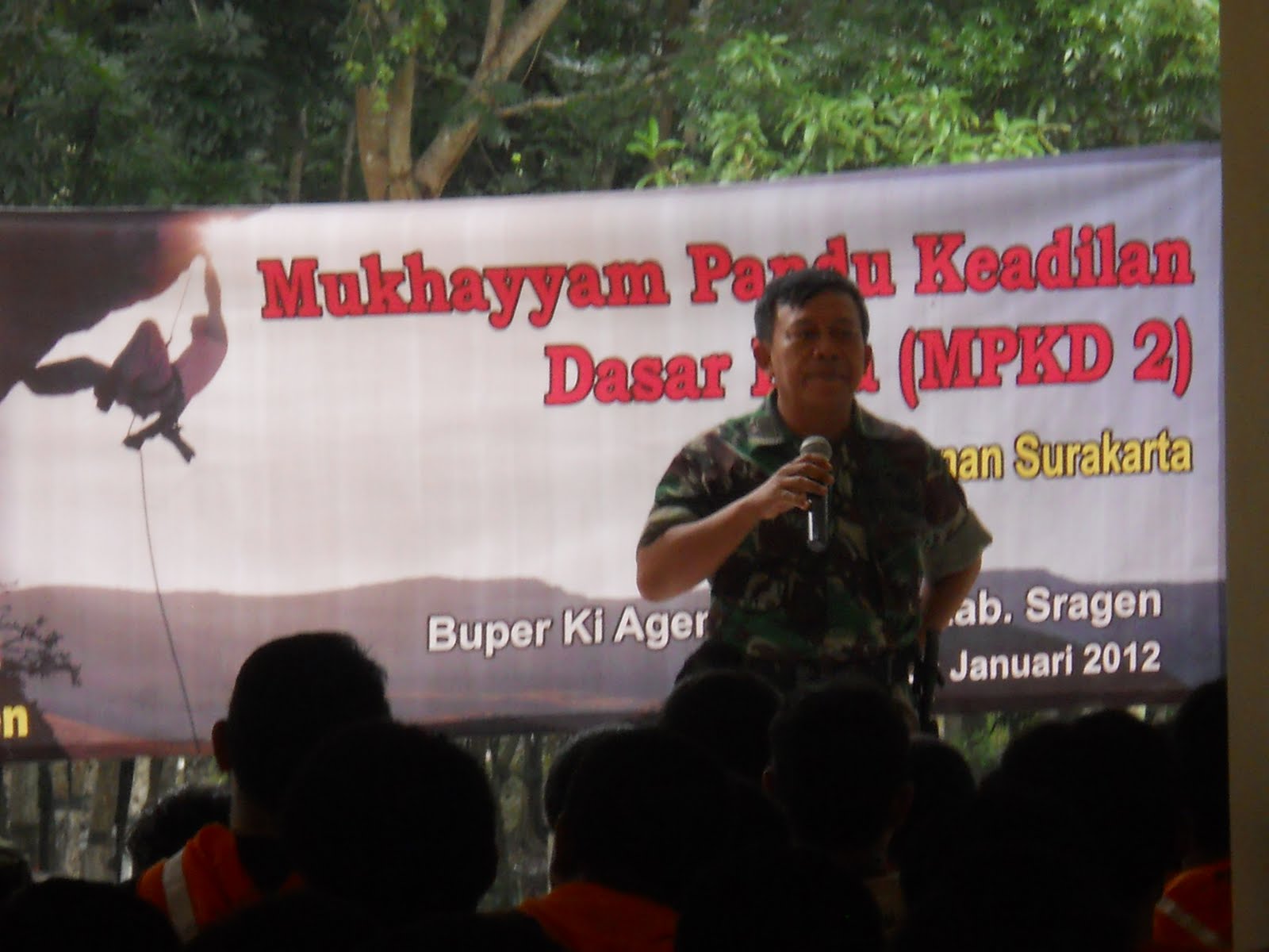 Pasiter Kodim 0725/Sragen Kapten Inf. Winarno mewakili Dandim 0725/Sragen memberikan penyuluhan tentang Ketahanan Nasional kepada peserta Mukhayam Pandu Keadilan Dasar 2 (MPKD2) se eks. Kars. Surakarta dilaksanakan pada hari Sabtu 29 Januari 2012 di Bumi Perkemahan Kyai Srenggi Sambirejo Sragen.   Kegiatan MPKD2 ini diselenggarakan oleh Kader Partai Keadilan Sejahtera Kab. Sragen diikuti + 150 orang peserta selama 2 hari dimaksudkan untuk membekali para peserta MPKD2 agar lebih memahami dan mengetahui akan pentingnya Ketahanan nasional.