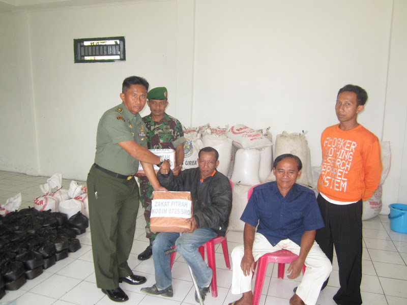 Sejumlah 2.265 Kg beras zakat fitrah dari seluruh keluarga besar Kodim 0725/Sragen disalurkan kepada kaum dzu’afa dan fakir miskin se wilayah Sragen pada hari ini, Selasa 15 Agustus 2012 di Aula Sukowati Kodim 0725/Sragen.   Kegiatan penyerahan  Zakat Fitrah Anggota Kodim 0725/Sragen secara simbolis dilaksanakan oleh Kepala Staf Kodim 0725/Sragen Mayor Inf. Mantang diserahkan kepada salah seorang penerima zakat dari Penyandang Cacat, Panti Anak Yatim Piatu dan Fakir Miskin.   Dalam kesempatan penyerahan Zakat Fitrah Kasdim 0725/Sragen menyampaikan permohonan maaf dari Dandim 0725/Sragen karena tidak bisa menyerahkan langsung zakat fitrah ini karena sedang bertugas memantau Posko Mudik TNI-Polri di wilayah Sragen.  Namun beliau berpesan agar zakat fitrah yang diberikan ini bisa sedikit membantu dan meringankan beban bagi yang menerima sehingga dalam menyambut Idul Fitri nanti benar-benar dalam suasana suka cita.