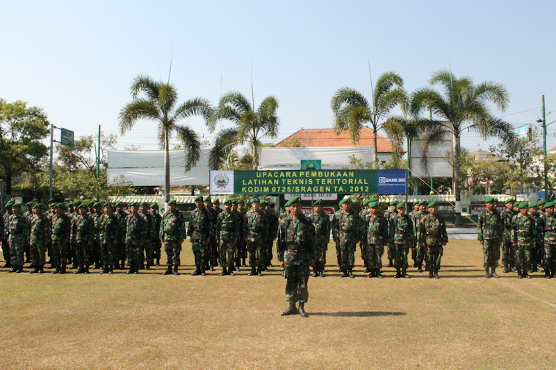 Komandan Kodim 0725/Sragen Letkol Inf R. Wahyu Sugiarto S.IP membuka Latihan Tehnis Teritorial TA. 2012 pada pagi ini Senin, 03/08/2012 di Lap. Makodim 0725/Sragen. Kegiatan Latnister diikuti oleh seluruh prajurit Kodim 0725/Sragen. didalam amanatnya Dandim 0725/Sragen menyampaikan bahwa,