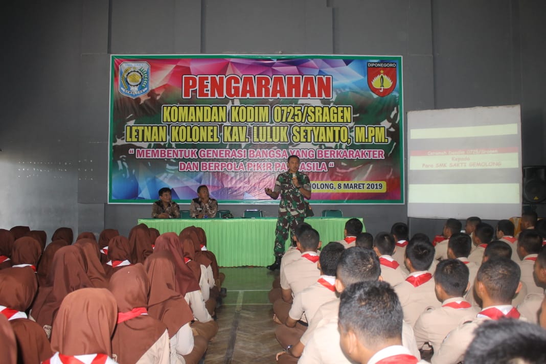 Jumat, 8 Maret 2019 pukul 08.45 – 10.20 Wib di GOR SMK Sakti Gemolong dilaksanakan pengarahan Dandim 0725/Sragen kepada Siswa/i SMK Sakti Gemolong dengan mengambil tema “Membentuk Generasi Bangsa Yang Berkarakter dan Berpola Pikir Pancasila” , yang dihadiri kurang lebih 500 orang.