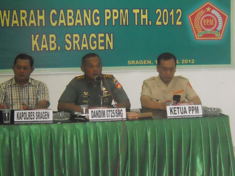 Komandan Kodim 0725/Sragen Letkol Inf R. Wahyu Sugiarto, S.IP membuka pelaksanaan Muscab PPM Cab. Sragen periode 2012 pada Hari Jum’at Tanggal 13 April 2012 di Ruang Siaga Sukowati Kodim 0725/Sragen. Muscab PPM TH. 2012 Kab. Sragen. Muscab yang dilaksanakan dengan agenda pemilihan Kepengurusan PPM Cab. Sragen periode 2012 – 2016 ini dihadiri oleh 60 orang anggota dari 23 ranting se-Kab. Sragen. Dalam kata sambutannya Dandim 0725/Sragen menyampaikan :