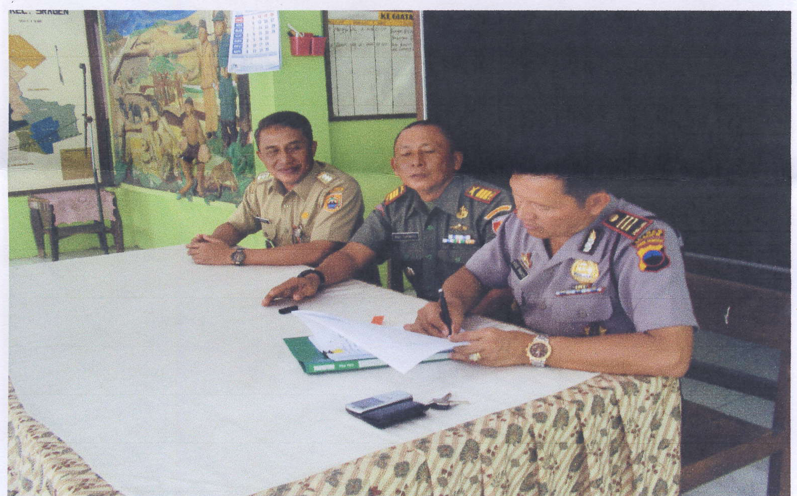 Muspika Kec. Sragen melaksanakan penandatanganan Buku Sinergitas penanganan masalah di Wilayah Kec. Sragen pada Hari Senin Tanggal 27 Februari 2012 di Pendopo Kantor Kecamatan Sragen.  Buku Sinergitas penanganan masalah Tingkat Kec. Sragen ditanda tangani oleh Muspika Kec. Sragen antara lain Kapten Inf Agus Suprapto selaku Danramil 01/Sragen, Sutrisna M.Si Selaku Camat Sragen dan AKP Agus Irianto SH. Selaku Kapolsek Sragen.  Penandatanganan  Buku Sinergitas tersebut merupakan implementasi dari Program kerja Kodim 0725/Sragen TA 2012 tentang Pedoman Sinergitas dalam penanganan masalah di Wilayah.