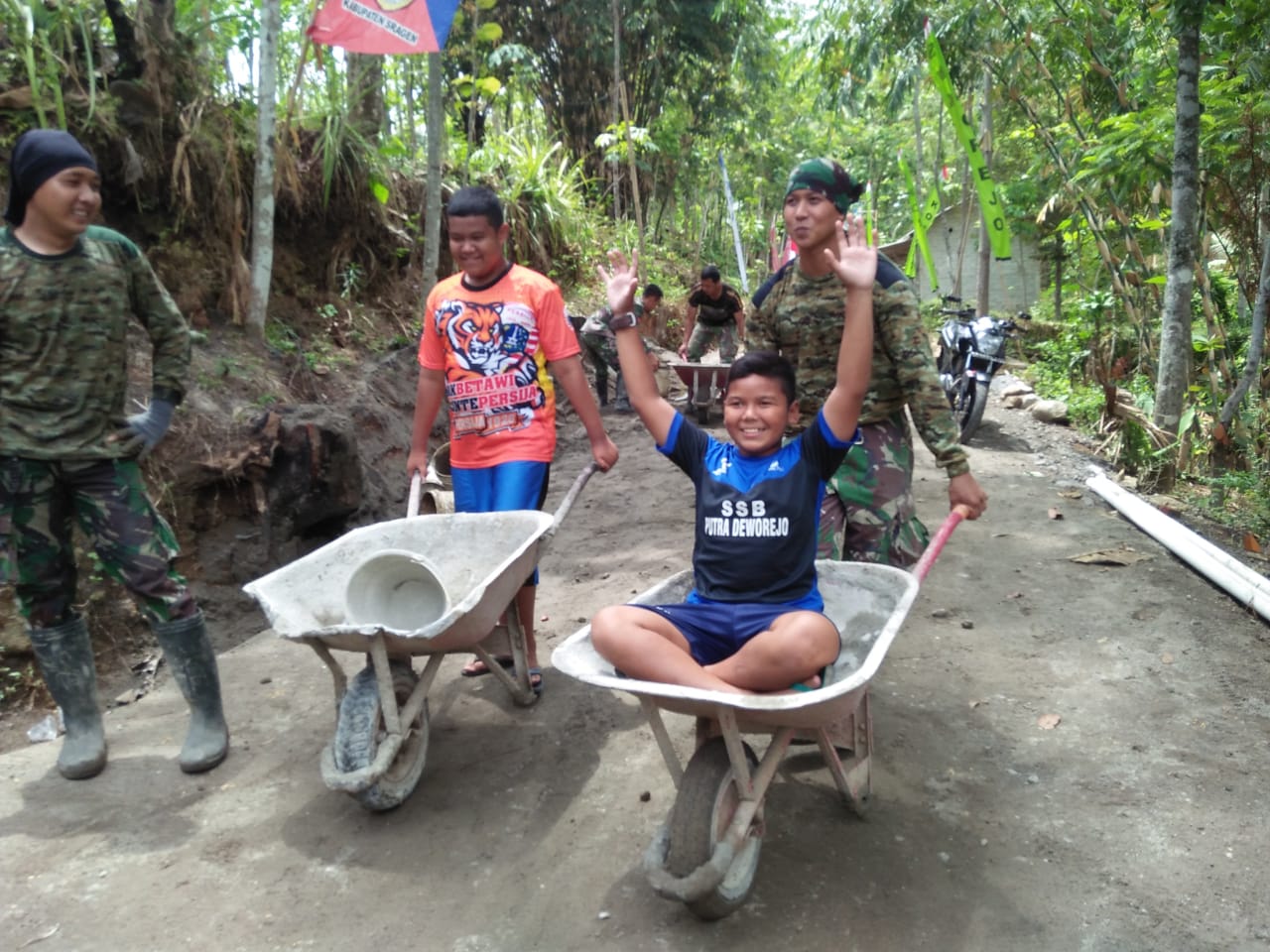 terlihat membantu Satgas dalam mengerjakan cor jalan di dekat rumahnya. Dirinya
