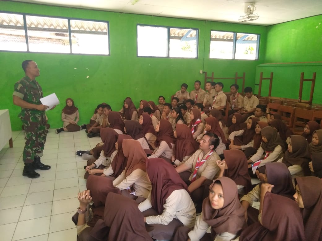 Babinsa Sine Serda Mikha memberikan materi wasbang dilanjutkan sosialisasi Lomba Karya Tulis dalam rangka memperingati HUT TNI ke 74 bertempat di SMK Widya Wisata Sragen, Jum’at ( 06/09/19 ).