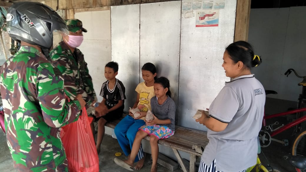 Selasa, 30 Juni 2020 Pkl 11.10 – 12.30 Wib Anggota Koramil 06 / Gondang dan dua Anggota Polsek Gondang Kec Gondang kab Sragen membagikan 150 bungkus nasi dari Kodim 0725 / Sragen kepada Buruh Pedagang dan masyarakat Desa Gondang.