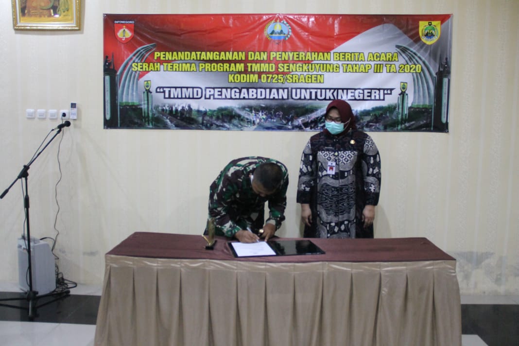 Pelaksanaan pembukaan TMMD hari ini hanya penandatanganan naskah dan penyerahan berita acara serah terima program TMMD Sengkuyung tahap III TA 2020 dari Bupati Sragen kepada Dandim 0725/Srg Letkol Inf Anggoro Heri Pratikno,S.I.P di ruang transit Pemkab Sragen. Hanya 13 Orang undangan yang menyaksikan penandatanganan dan tanpa ada amanat. Diantaranya Ketua DPRD, Kapolres sragen, Kajari, KA DPUPR, Danramil Miri, Kapolsek Miri, Camat miri, Kepala Dinas PMD, KA UPTPK, KA PMI, Kepala Bapeda dan Kepala Desa Gilirejo, Kadus Pringapus Ds. Gilirejo.